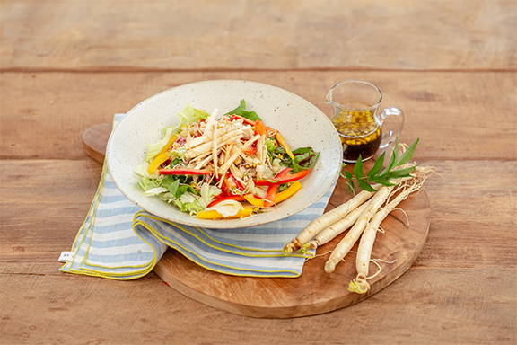 Mit verschiedenen Gemüsesorten und Ginseng, die Sie je nach Dressing genießen können.
